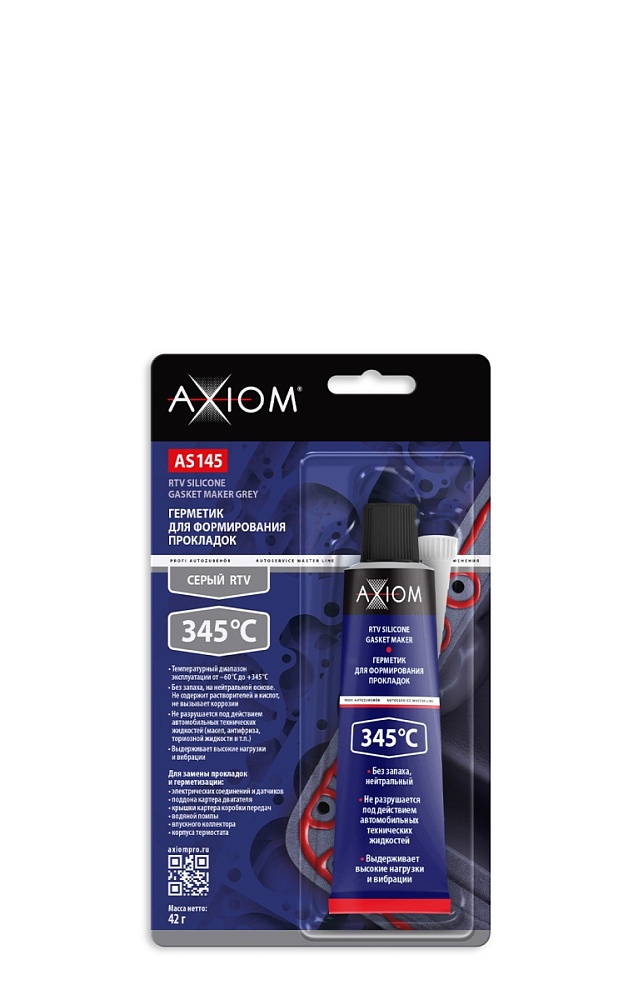 Высокотемпературный однокомпонентный автомобильный силиконовый герметик AXIOM® AS145 применяется для формирования или ремонта прокладок в узлах автомобиля, подверженных воздействию высоких температур, таких как поддон картера и коробки передач, водяной насос, крышка газораспределительного механизма, корпус термостата и других. Способен заменить прокладки, сальники, а также бумажные, резиновые, металлические и другие уплотнители.Не содержит растворителей и кислот, не вызывает коррозии, может применяться для герметизации электрических соединений и датчиков. Вулканизирующийся при комнатной температуре RTV‑силикон образует прочную, эластичную прокладку (удлинение до разрыва ≈400%). Обладает повышенной адгезией к поверхностям из стали, чугуна, алюминия. Стоек к воздействию технических жидкостей автомобиля (смазочных материалов, охлаждающих жидкостей, растворов кислот и щёлочей). Заполняет полости и зазоры до 7 мм.
